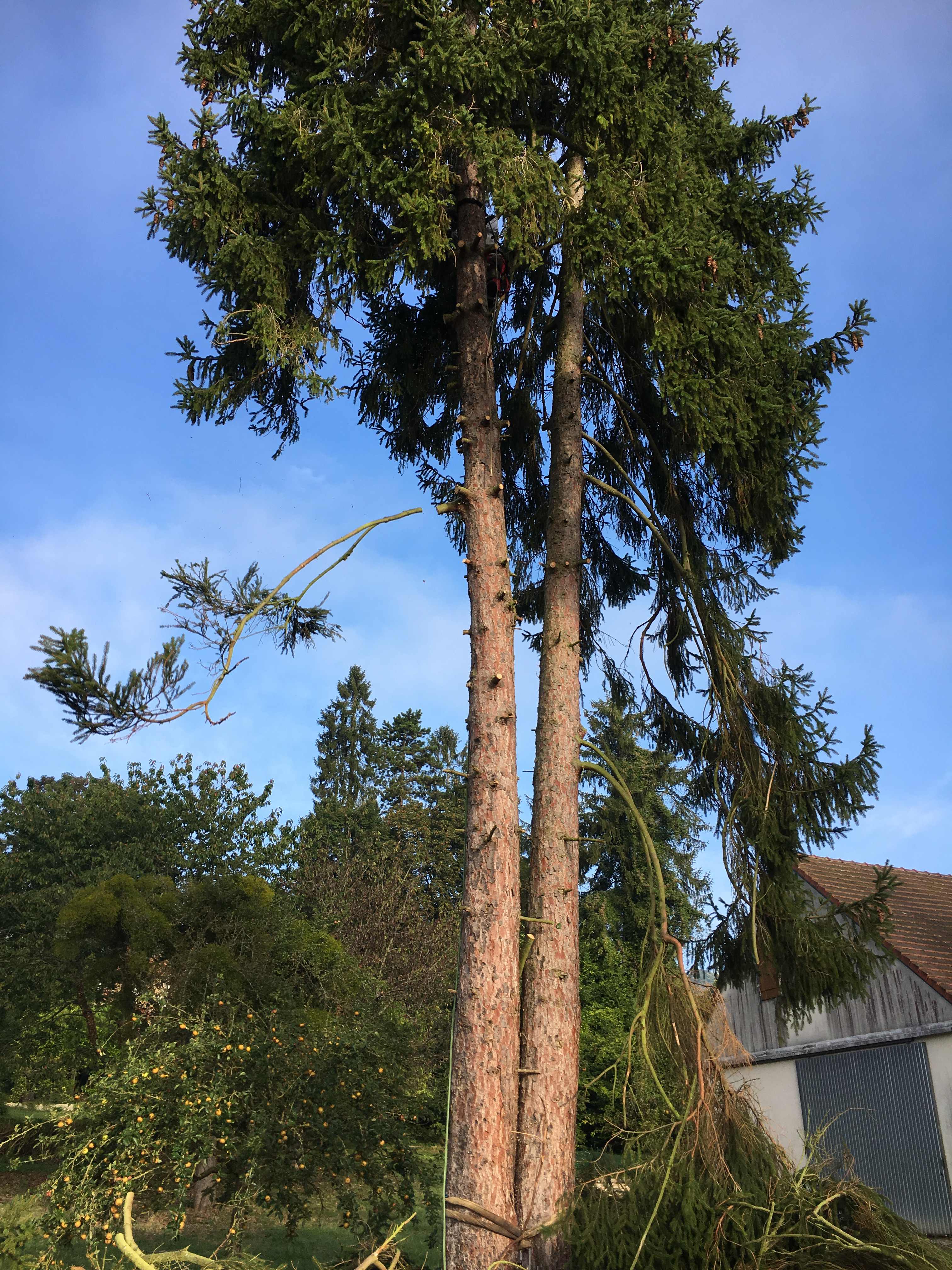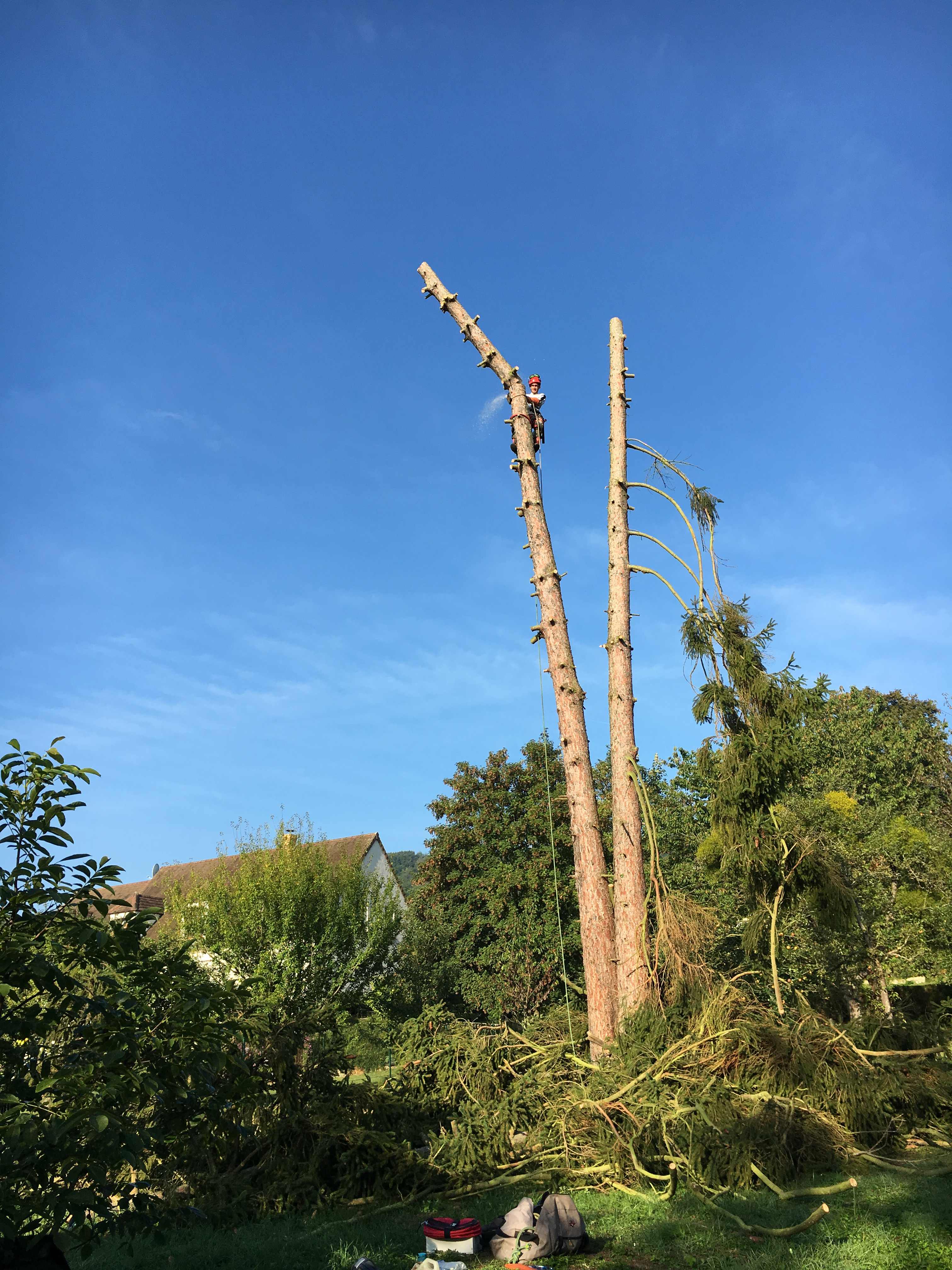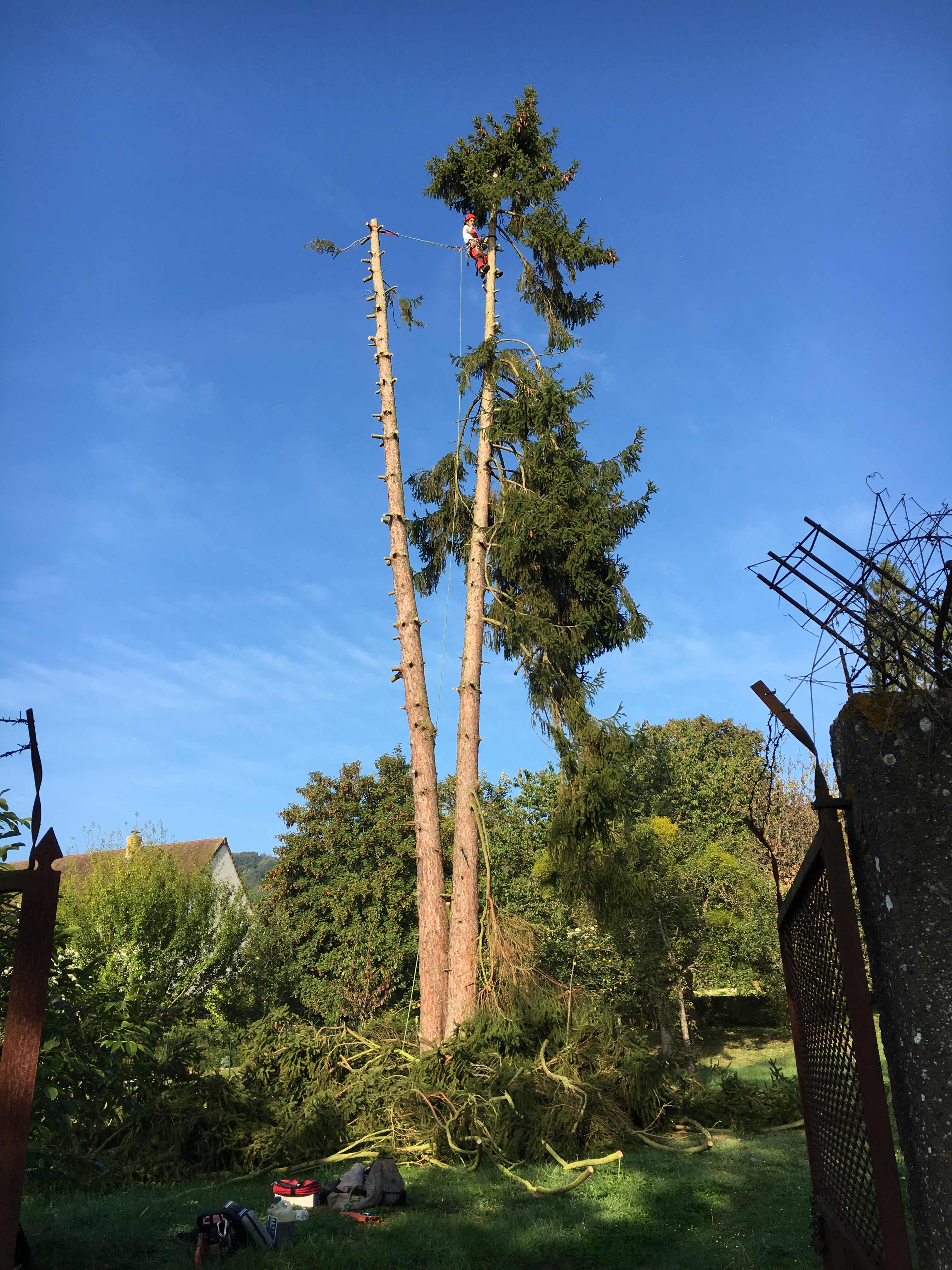 Chantier d'abattage d'arbre par démontage d'un double sapin à Chateau-thierry